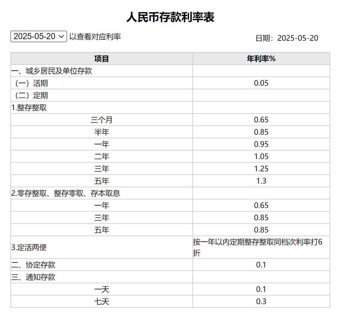 交通银行也宣布自2025年5月20日起调整人民币存款挂牌利率,活期存款年利率降至0.05%,一年期、三年期和五年期整存整取利率分别调整至0.95%、1.25%和1.3%,七天期通知存款利率下调至0.3%。