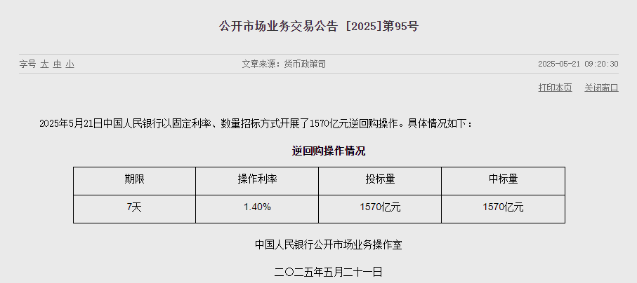 中国人民银行网站消息,5月21日,中国人民银行以固定利率、数量招标方式开展了1570亿元逆回购操作,操作利率维持在1.40%不变,与前期保持一致;由于当日有920亿元7天期逆回购到期,因此实现净投放650亿元,此举旨在保持市场流动性合理充裕。