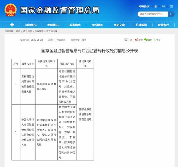中国网财经5月24日讯 昨日,国家金融监督管理总局江西监管局(简称“江西监管局”)发布行政处罚信息,披露雪松国际信托股份有限公司(简称“雪松信托”)及相关责任人因重要信息系统数据不真实,被处以严厉处罚。江西监管局对雪松信托罚款20万元,同时对梁伟、李楠等责任人员发出警告并罚款共计42万元。此事件再次凸显了金融监管机构对金融机构数据真实性的高度重视。