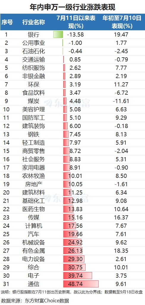 周五盘中,银行股再次走低,“四大行”盘中均一度跌超1%,工商银行、农业银行甚至跌超过2%。整体板块而言,银行股指数自7月11日盘中创出历史新高后,便一路震荡走低,目前已回调超过10%。银行股调整(SEO关键词1)成为市场关注焦点,东方财富Choice数据显示,截至9月18日收盘,银行自7月11日以来的累计跌幅为13.58%,是申万一级行业中跌幅最大的,也是唯一跌幅超10%的行业。