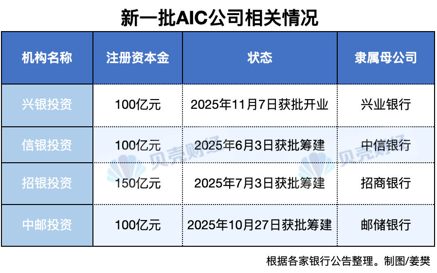 在兴业银行获批筹建AIC之后,中信银行、招商银行相继发布公告,获批筹建旗下AIC公司。10月,作为国有银行的邮储银行亦发布公告称,已获监管批复筹建中邮金融资产投资有限公司,显示出银行业在金融投资领域的全面布局。