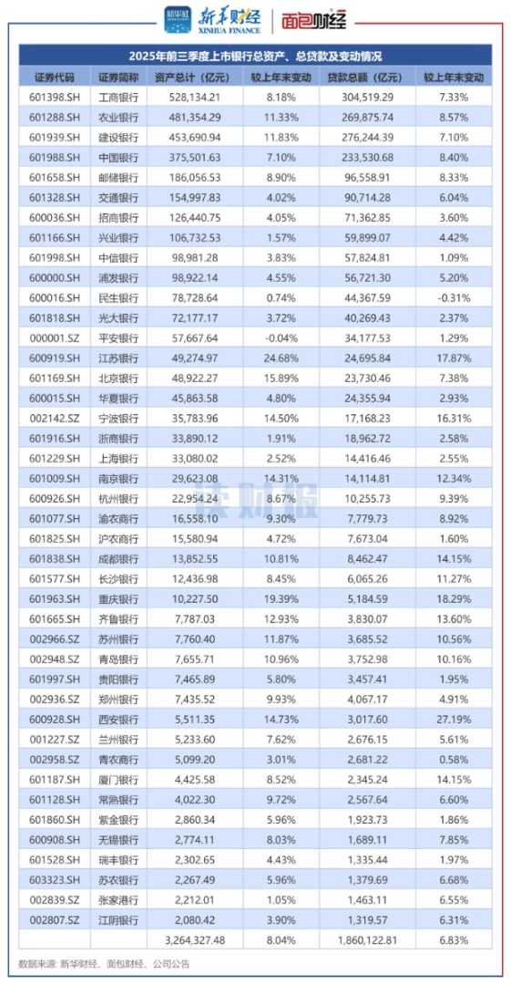 图2:2025年前三季度上市银行总资产、总贷款及变动情况