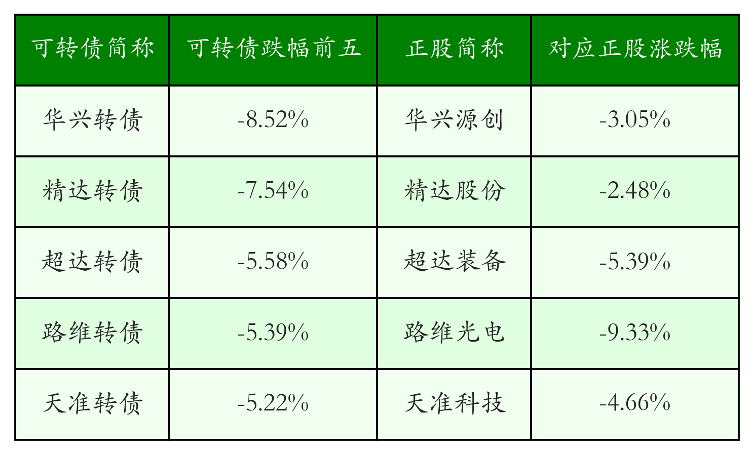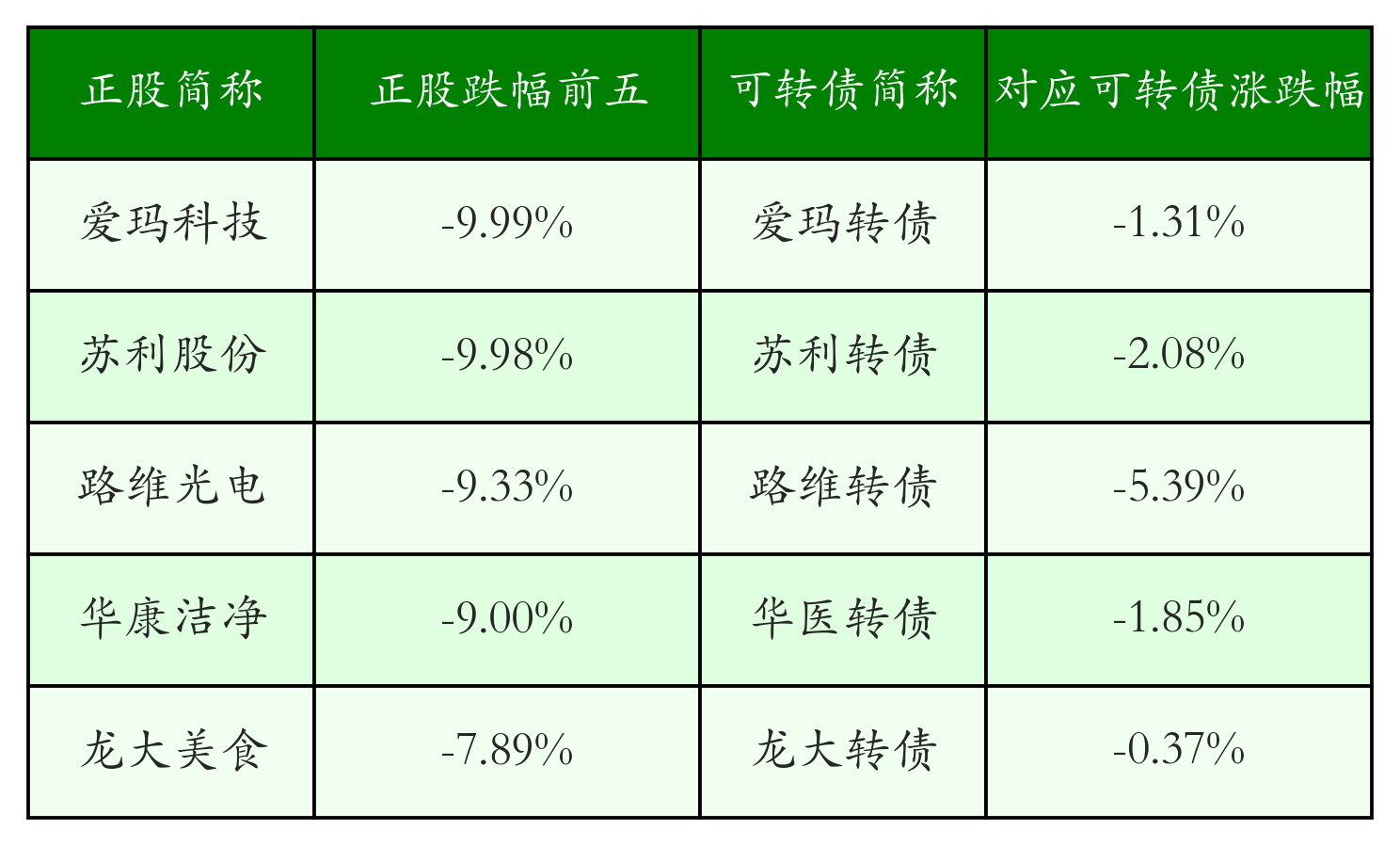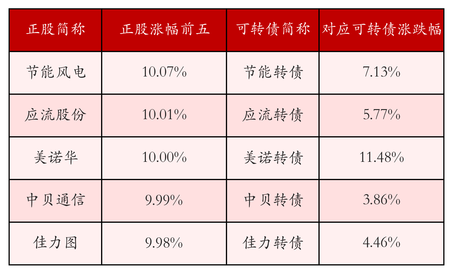 南财智讯4月23日电,盘后数据显示,债市方面,中证转债指数收跌0.44%,报515.83,成交额为795.0亿元。可转债方面,今日共成交335只可转债,其中71只收涨,0只收平,264只收跌。具体来看,13只可转债涨幅超过2%。其中晶科转债(113048)涨13.09%,美诺转债(113618)涨11.48%,节能转债(113051)涨7.13%。今日有49只可转债跌幅超2%,华兴转债(118003)跌8.52%,精达转债(110074)跌7.54%,超达转债(123187)跌5.58%。存在交易量的可转债所对应的正股中,95只收涨,7只收平,233只收跌。具体来看,16只可转债对应正股涨幅超过5%,其中,节能风电(601016)涨停,收涨10.07%;应流股份(603308)涨停,收涨10.01%;美诺华(603538)涨停,收涨10.0%。同时所对应的可转债:节能转债(113051)同涨7.13%;应流转债(113697)同涨5.77%;美诺转债(113618)同涨11.48%。今日有12只可转债对应正股跌幅超过5%,爱玛科技(603529)跌停,收跌9.99%;苏利股份(603585)跌停,收跌9.98%。同时所对应的可转债:爱玛转债(113666)同跌1.31%;苏利转债(113640)同跌2.08%。