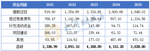 表2:2021年—2025年河南省信用债募集资金用途情况(亿元)