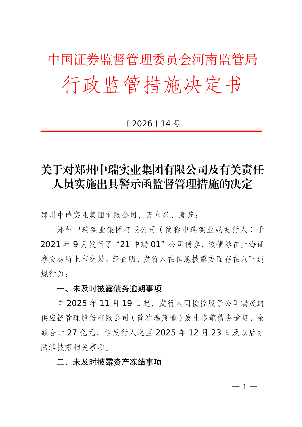 郑州中瑞实业集团被出具警示函,涉未及时披露债务逾期等