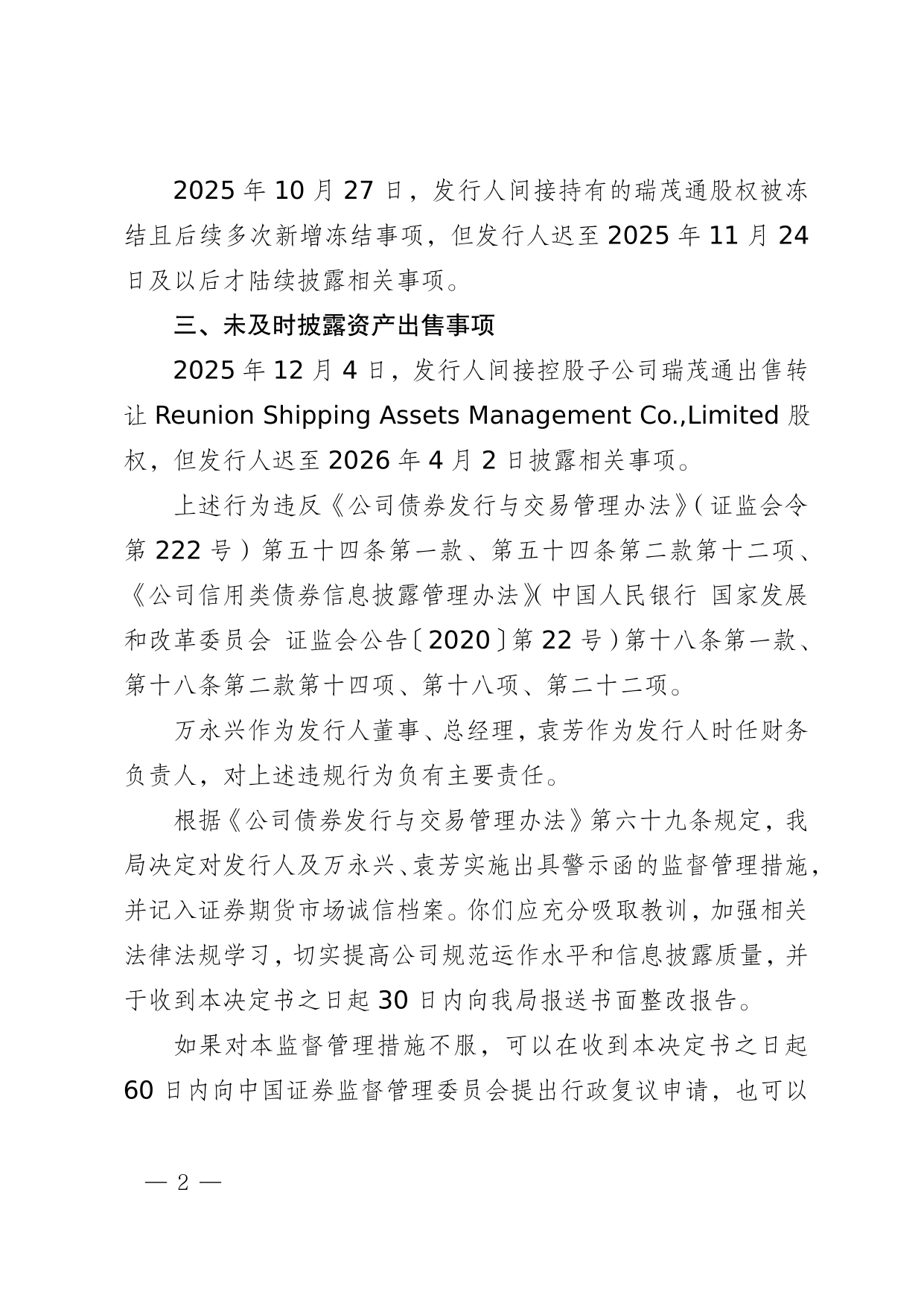 2025 年 12 月 4 日,发行人间接控股子公司瑞茂通出售转让 Reunion Shipping Assets Management Co.,Limited股权,但发行人迟至 2026 年 4 月2 日披露相关事项。