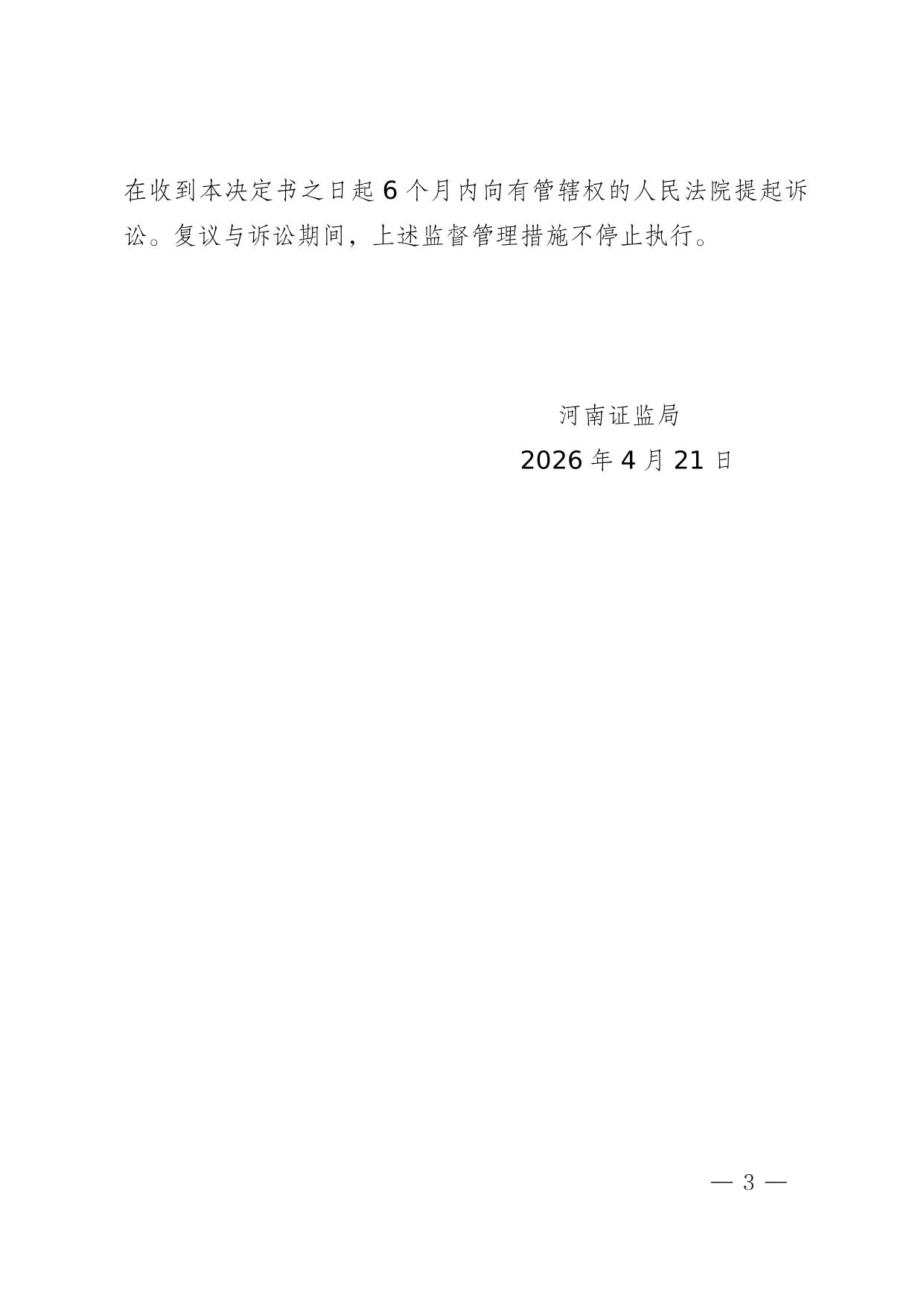 对此,河南证监局决定对郑州中瑞实业集团有限公司及万永兴、袁芳实施出具警示函的监督管理措施,并记入证券期货市场诚信档案。