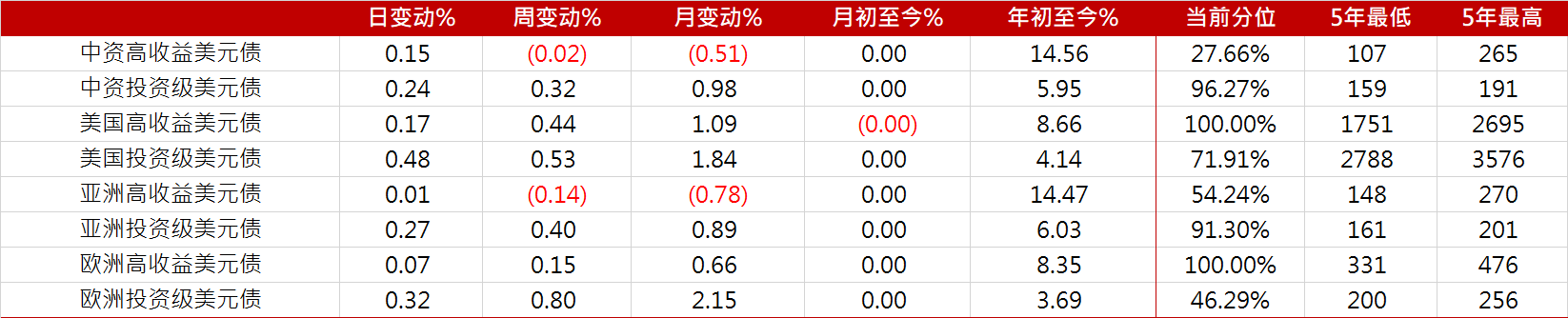 图1展示了中资及亚洲美元债指数的走势(基准=100),揭示了整体市场的波动情况。