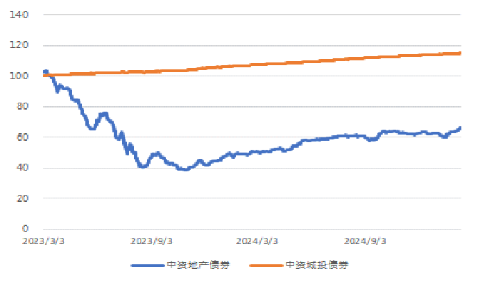 图2. 中资房地产、城投板块美元债指数走势(基准=100)
