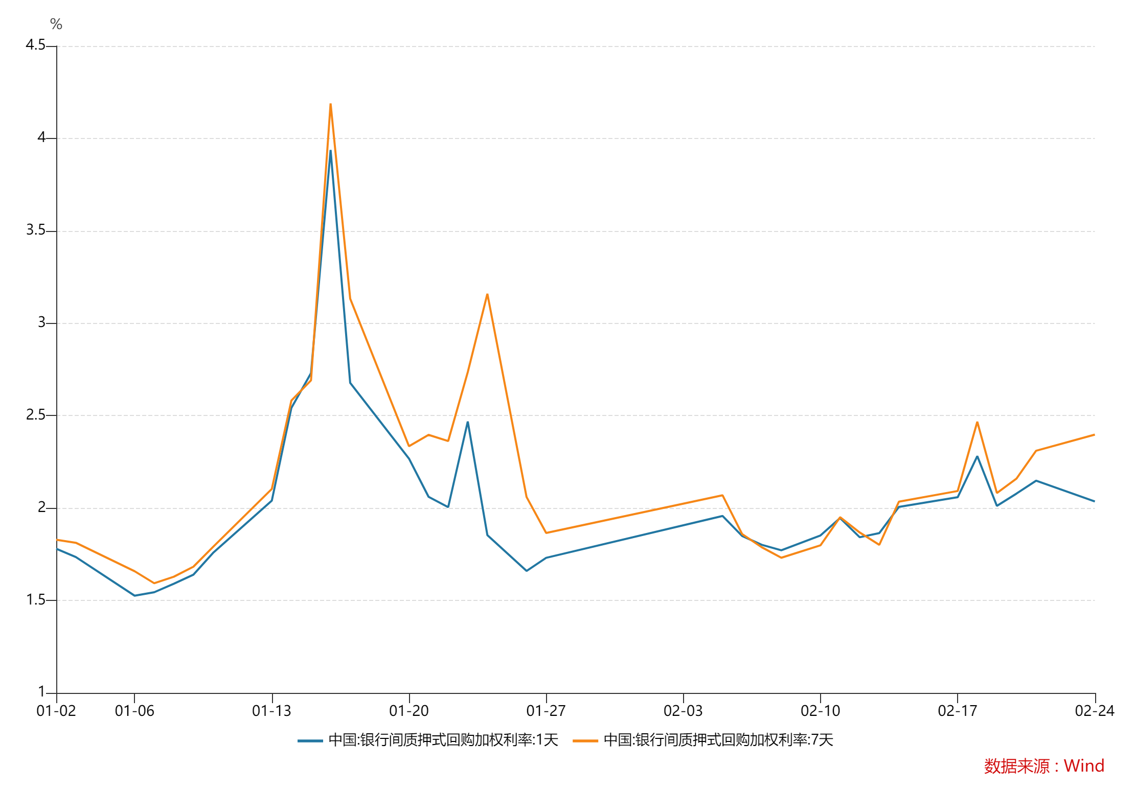 资金面上,跨年之后理财资金回流,但资金面并未因此宽松。上周五R001已经升至2.15%,相比春节前高出50BP,1年期IRS超过了1.7%。资金面的持续紧张或有两方面原因:一方面,汇率压力虽有所下降但并未完全消退;另一方面,债市前期定价了过多的宽松预期,央行预期管理效果不佳。不过,也有机构认为,尽管资金面偏紧是央行预期管理的结果,但央行重新加大资金面呵护力度的预期仍存。