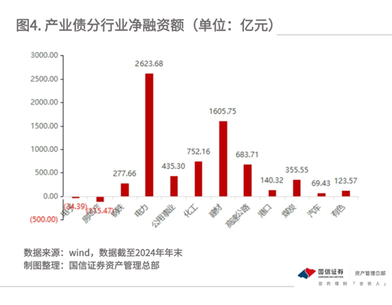 国信资管数据显示,2024年产业债发行约9.20万亿元,净融资额1.69万亿元,较2022和2023年均有所增加。非银金融、公用事业、交通运输、建筑装饰、煤炭石油行业的债券发行量合计占比三分之二,净融资额占比约72%。