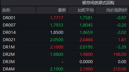 银银间回购定盘利率全线下跌,其中FDR001跌1个基点至1.77%;FDR007跌1个基点至1.81%;FDR014跌4个基点至1.86%。