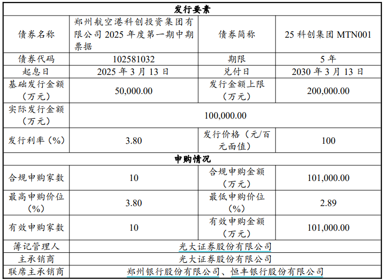 3月13日,郑州航空港科创投资集团成功发行2025年度第一期中期票据,简称“25科创集团MTN001”,发行规模10亿元,期限5年,利率3.80%,由光大证券、郑州银行、恒丰银行承销,资金用于偿还公司有息债务。