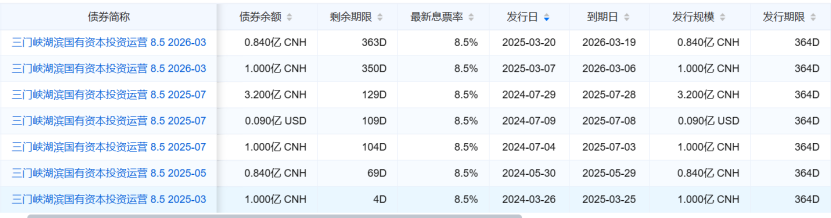 过去一年中,三门峡湖滨国投已发行7只中资离岸债,包括6只人民币债和1只美元债,票息均保持在8.5%的高水平。值得注意的是,去年3月发行的1亿元债券“三门峡湖滨国有资本投资运营 8.5 2025-03-25”即将到期。