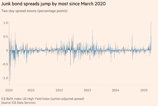 ICE美国银行数据显示,自关税宣布以来,投机级公司债相对于美国国债的溢价飙升100个基点至445个基点,创2020年新冠疫情以来最大信用利差涨幅,甚至超过硅谷银行危机期间水平。