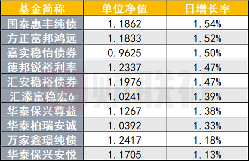 经历“疯狂的星期一”后,债市迎来暴涨,债基行情全面上扬。部分产品昨日净值涨幅超过1%,其中国泰惠丰纯债、方正富邦鸿远、嘉实稳怡债券净值增长分别达1.54%、1.52%和1.50%,位居前列。