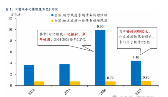信达证券宏观首席分析师解运亮介绍,今年计划用于化债的额度包括“2万亿特殊再融资债”和“0.8万亿特殊新增专项债”。一季度特殊再融资债发行进度已达67%,整体发行节奏明显前置。特殊新增专项债一季度发行进度为15%,相对较慢。两部分化债资金合计约1.46万亿,占地方债券发行总额的51%,尽管特殊新增专项债发行进度略慢,但整体化债发行进展顺利。