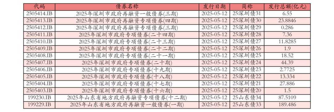 2025年5月12日,全国共发行14支地方政府债券,总额437.2085亿元。其中政府一般专项债发行2支,地方政府专项债发行12支。25山东债33和25深圳债24发行规模靠前,提供了重要的市场参考信息。