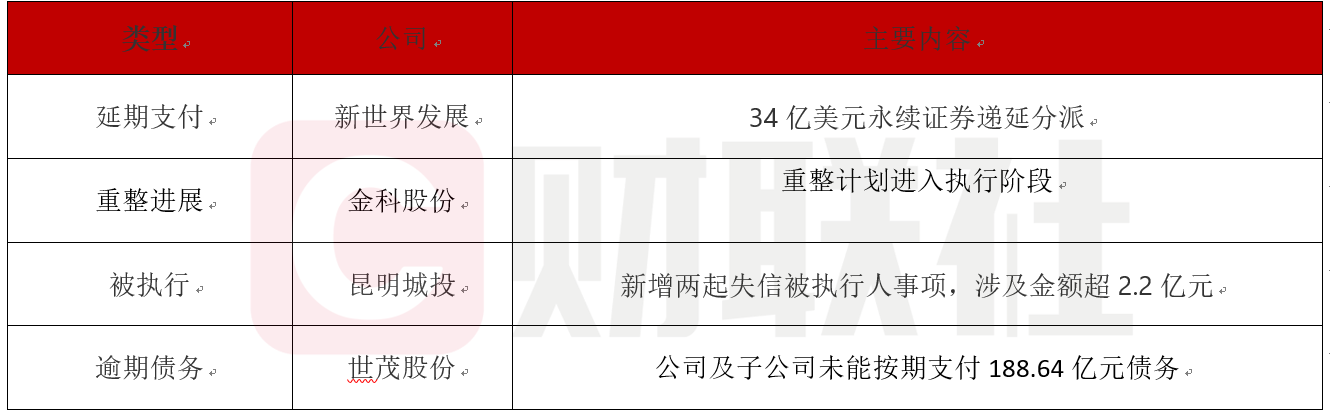 新世界发展宣布34亿美元永续证券递延分派,金科股份重整计划进入执行阶段,昆明城投新增两起失信被执行人事项涉及金额超2.2亿元,世茂股份未能按期支付188.64亿元债务。