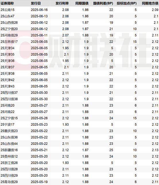 最新数据显示,30年期地方债平均发行利差约20BP。以今日发行的“25云南15”为例,发行利率2.08%,与30年期国债利差22BP,远高于5BP的投标加点,且与同期地方债二级市场收益率2.09%相近。