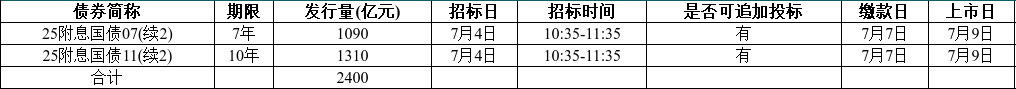 公号“宏飞论债”主理人王宏飞表示,资金面转松,债市做多情绪回暖,基金和保险是主要买盘。财政部公告称,拟于7月4日发行、续发合计2400亿元国债,期限分别为7年和10年。