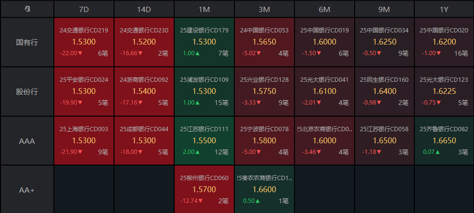 存单方面,今日3M期国股在1.54%-1.61%位置需求较好,较前一日下行5bp等。
