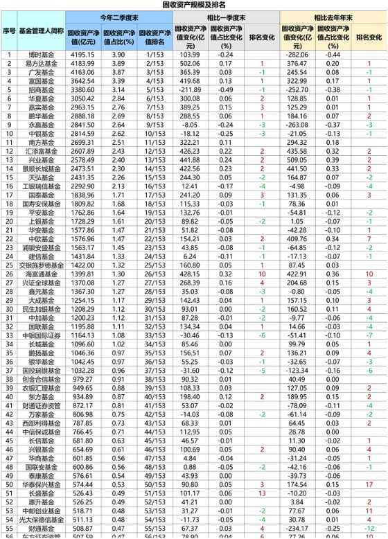 其中,博时基金以4195.15亿元的固收资产规模排名第一,易方达基金的固收资产规模为4183.99亿元,相比一季度增加了502.06亿元,从第三名赶超至第二名,广发基金以4163.06亿元排名第三位。
