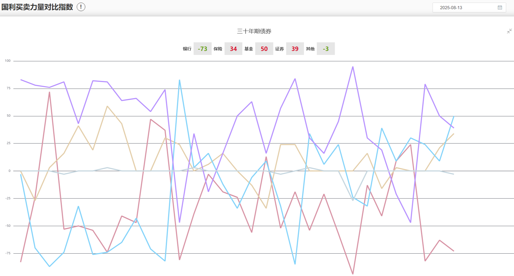 从交易数据来看,截至发稿,新华财经-国利买卖力量对比指数显示,8月13日的利率债主要卖盘来自银行,买盘主要来自险资和券商机构,基金小幅增持。