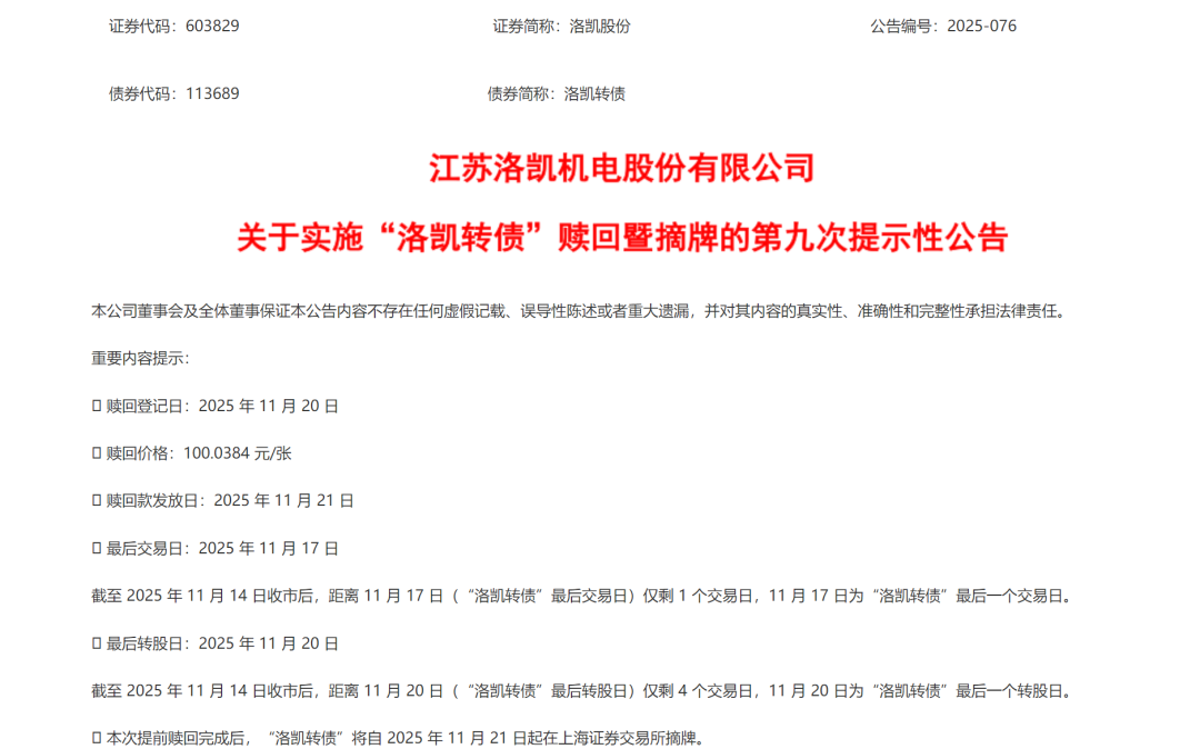洛凯股份发布关于实施“洛凯转债”赎回暨摘牌的第九次提示性公告,提醒投资者11月17日为洛凯转债最后一个交易日,11月20日是最后一个转股日,债券持有人应及时卖出或转股。11月20日收市后,未实施转股的洛凯转债将全部冻结,停止交易和转股。
