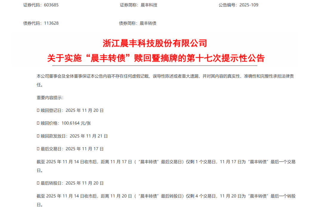 晨丰科技发布关于实施“晨丰转债”赎回暨摘牌的第十七次提示性公告,提醒投资者11月17日为晨丰转债最后一个交易日,11月20日是最后一个转股日,债券持有人应及时卖出或转股。11月17日(含当日)收市前,债券持有人可选择在债券市场继续交易。11月17日至20日(含当日)收市前,债券持有人可以12.77元/股的价格转换为公司股份。11月20日收市后,未及时转股的可转债将按照债券面值加当期应计利息的价格100.6164元/张被强制赎回。