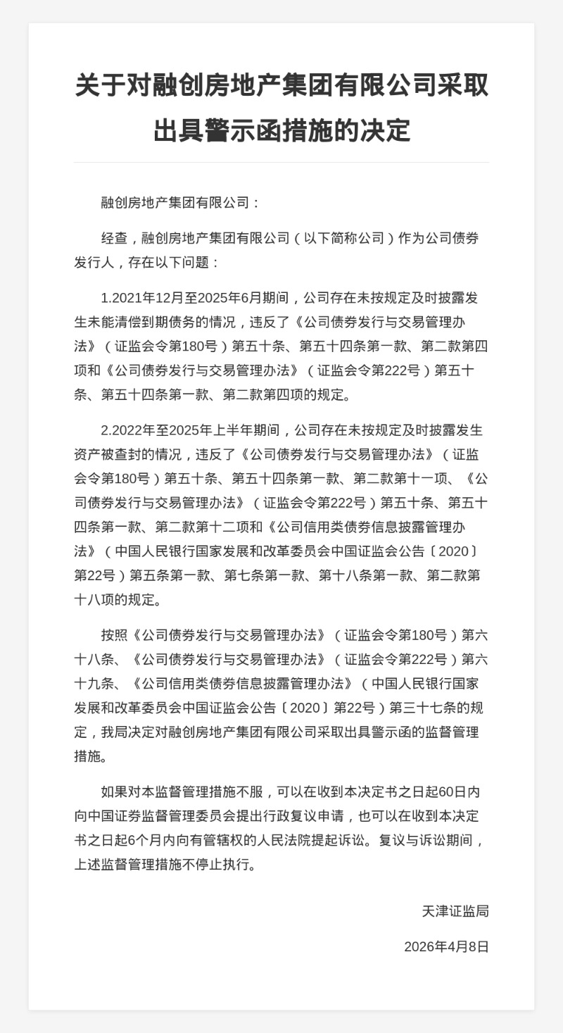 对此,天津证监局决定对融创房地产集团有限公司采取出具警示函的监督管理措施。