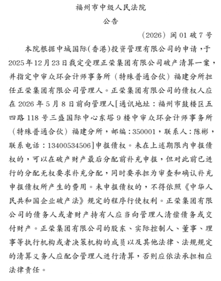 H20正荣2的违约,背后是“正荣系”的整体债务风险,就在数天前的4月2日,正荣集团有限公司被福州市中级人民法院裁定受理破产清算案,这意味着,这家曾经连续四年销售额突破千亿、在2021年达到1456亿元历史峰值的闽系房企,正式走到了终点。
