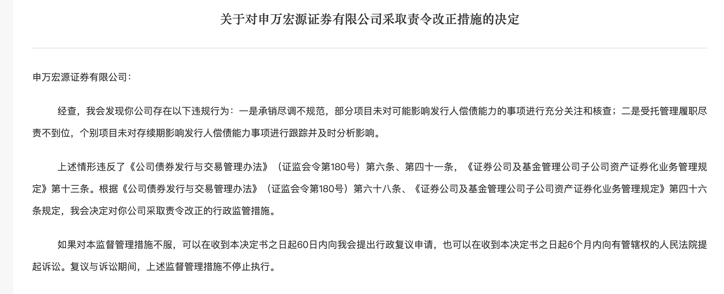 2024年2月,证监会发布公告,对申万宏源证券采取责令改正措施,指出其承销尽调不规范,部分项目未对可能影响发行人偿债能力的事项进行充分关注和核查;受托管理履职尽责不到位,个别项目未对存续期影响发行人偿债能力事项进行跟踪并及时分析影响。
