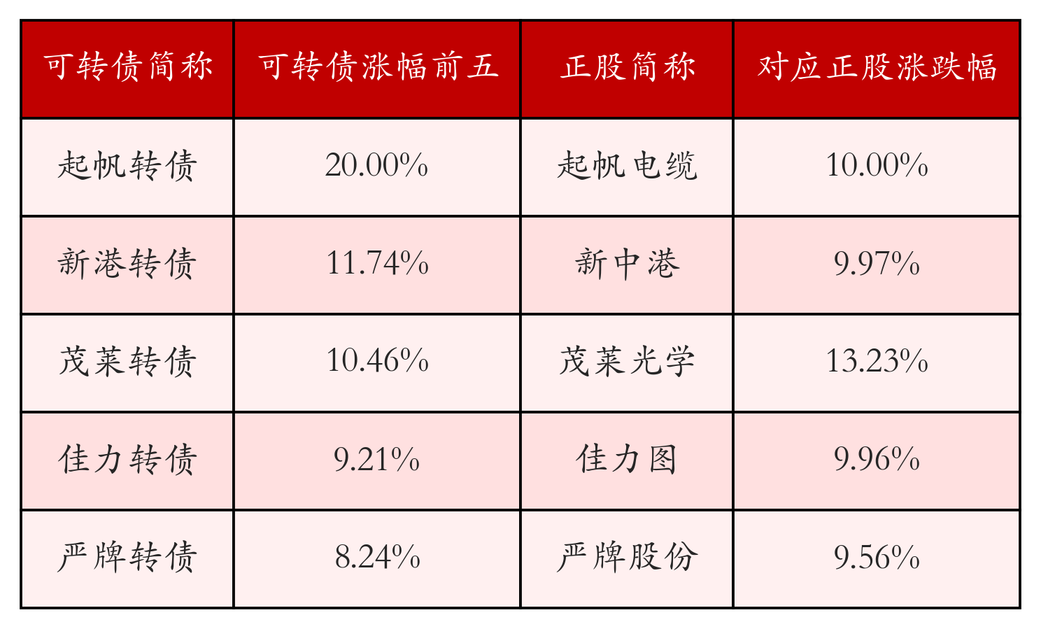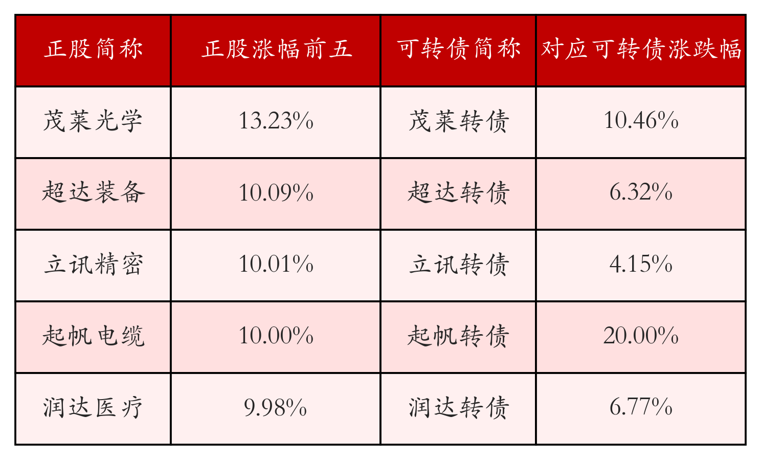 南财智讯4月20日电,盘后数据显示,债市方面,中证转债指数收涨0.09%,报516.28,成交额为750.92亿元。可转债方面,今日共成交338只可转债,其中166只收涨,1只收平,171只收跌。具体来看,29只可转债涨幅超过2%。其中起帆转债(111000)涨20.0%,新港转债(111013)涨11.74%,茂莱转债(118061)涨10.46%。今日有11只可转债跌幅超2%,蓝晓转02(123195)跌6.44%,岱美转债(113673)跌4.88%,精装转债(127055)跌3.65%。存在交易量的可转债所对应的正股中,195只收涨,11只收平,132只收跌。具体来看,19只可转债对应正股涨幅超过5%,其中,立讯精密(002475)涨停,收涨10.01%。同时所对应的可转债:立讯转债(128136)同涨4.15%。今日有6只可转债对应正股跌幅超过5%,没有正股跌停。