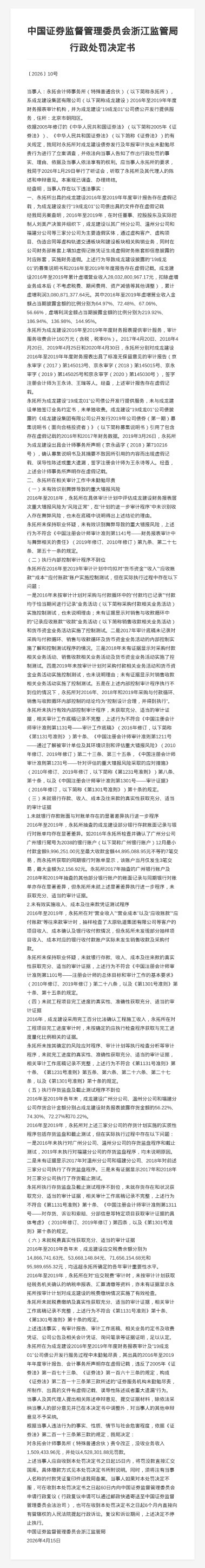 决定书显示,永拓会计师事务所(特殊普通合伙)出具的成龙建设2016年至2019年年度审计报告存在
