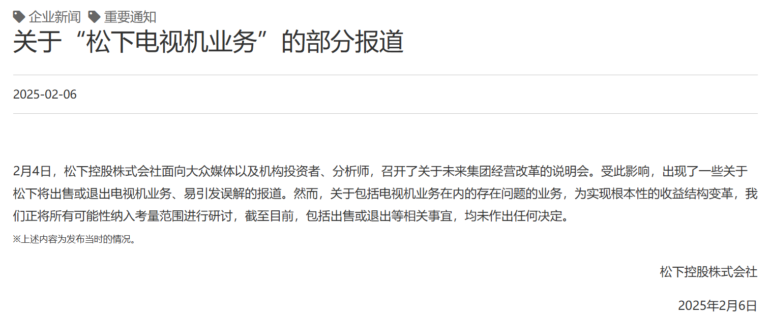 2025年2月6日,松下电器在其官方网站上正式发布声明,披露了2月4日松下控股株式会社面向媒体、机构投资者及分析师所召开的经营改革说明会的详情。此次会议引发了外界对松下可能出售或退出电视机业务的猜测,甚至有报道出现了误导性信息。对此,松下电器明确回应,针对包括电视机业务在内的多项业务挑战,公司正在积极研讨各种可能性,以实现收益结构的根本性变革。但截至目前,关于出售或退出电视机业务等任何相关决策均未最终确定。