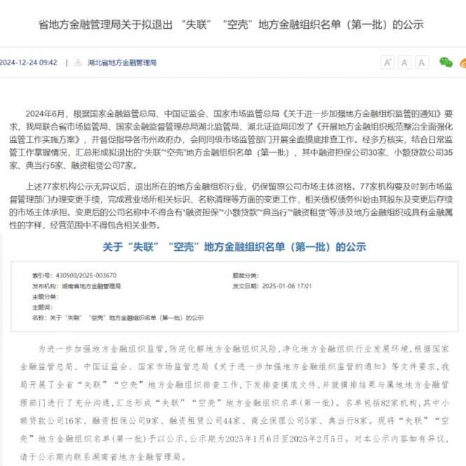 近两月,多个省市的地方金融管理局亦发布了当地金融组织的年审、清退信息,包括湖南和湖北在内的金融监管局均发布了“失联”“空壳”地方金融组织名单。湖南省已排查出82家机构,湖北省亦汇总形成77家拟退出机构名单。