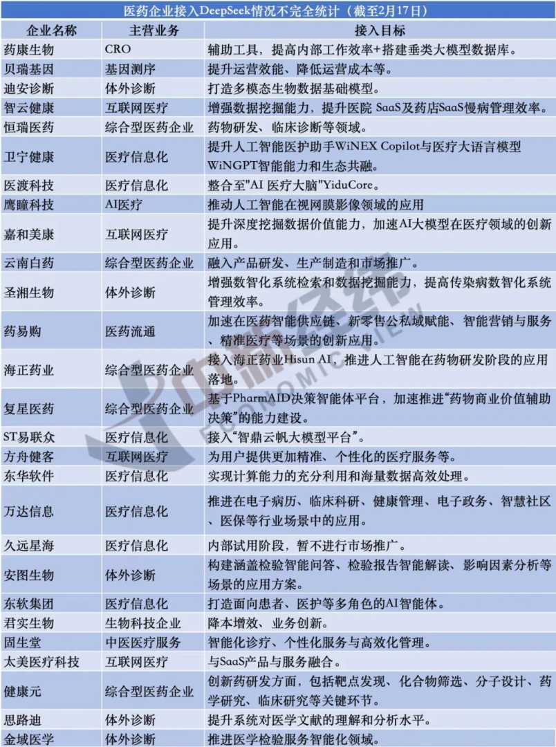 据“V观财报”不完全统计,截至2月17日晚,已有27家在AH股上市的医药企业宣布接入DeepSeek,探索AI在医疗领域的新应用。