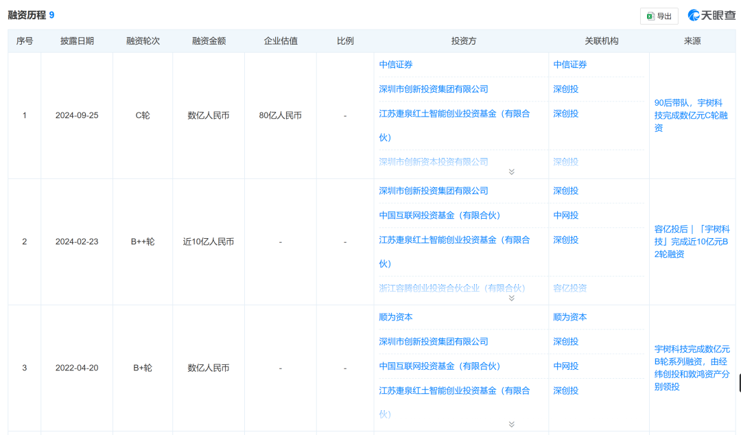 天眼查显示,宇树科技已完成9轮融资,已披露的融资规模超17亿元,最近一轮为2024年9月的C轮融资,估值达80亿元。投资方包括深创投、北京机器人产业投资基金等。红杉中国、顺为资本、美团等国内知名投资机构也曾投资宇树科技。