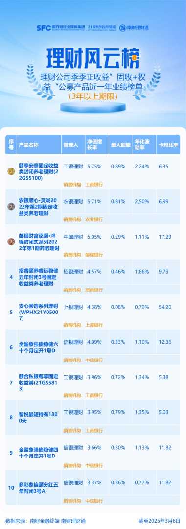 南财理财通数据显示,截至3月6日,理财公司3年以上期限“固收+权益”公募人民币理财近一年算术平均净值增长率为3.83%,四成产品超4%。工银理财、上银理财和中邮理财平均收益领先。多只养老理财产品上榜,风险控制能力较强。