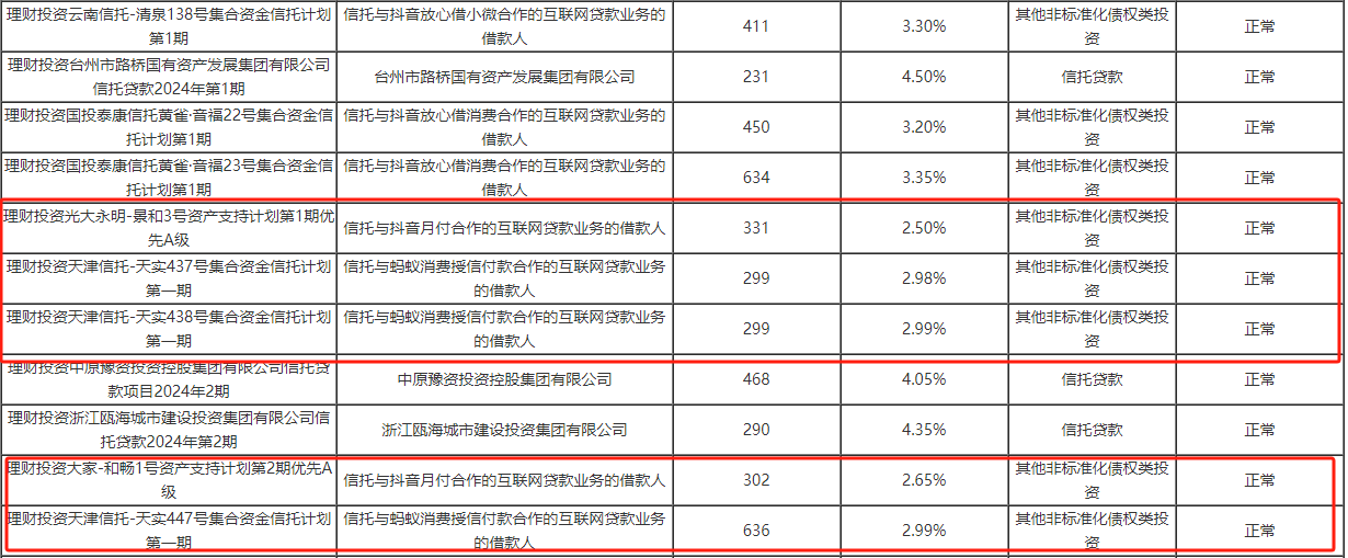 同样值得关注的是,榜单第三名中邮理财的“邮银财富添颐·鸿锦封闭式系列2022年第1期养老理财”在2024年末持仓二十余项非标资产,主要涉及区域性城投公司和互联网贷款公司,合计占总资产比例的45.06%。然而,多笔互联网小额贷款资产收益率跌破3%,其中“理财投资光大永明-景和3号资产支持计划第1期优先A级”涉及抖音月付互联网贷款业务,到期收益分配利率为2.5%,2024年末剩余期限331天。