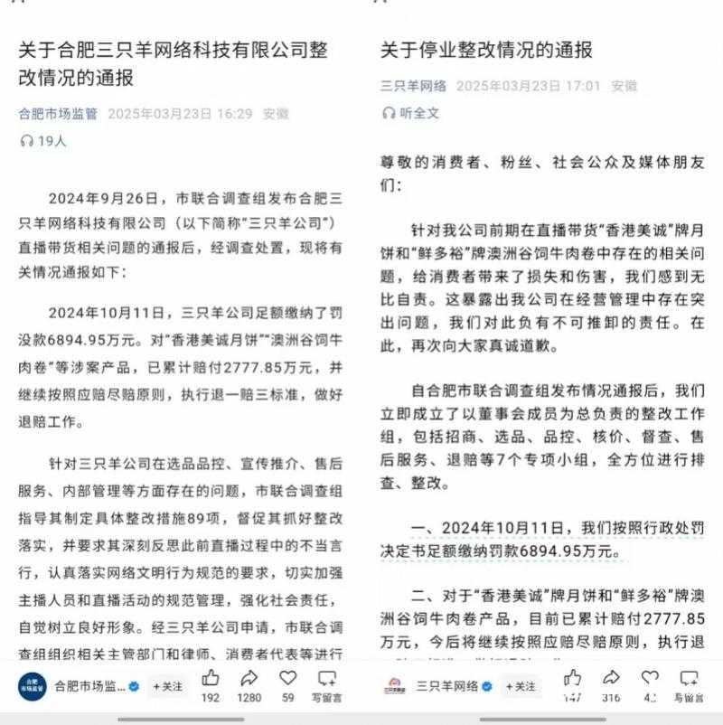 3月23日,合肥市市场监管局发布关于合肥三只羊网络科技有限公司整改情况的通报。通报显示,2024年10月11日,三只羊公司已足额缴纳6894.95万元罚没款,并对“香港美诚月饼”“澳洲谷饲牛肉卷”等涉案产品累计赔付2777.85万元,持续按照应赔尽赔原则执行退一赔三标准。