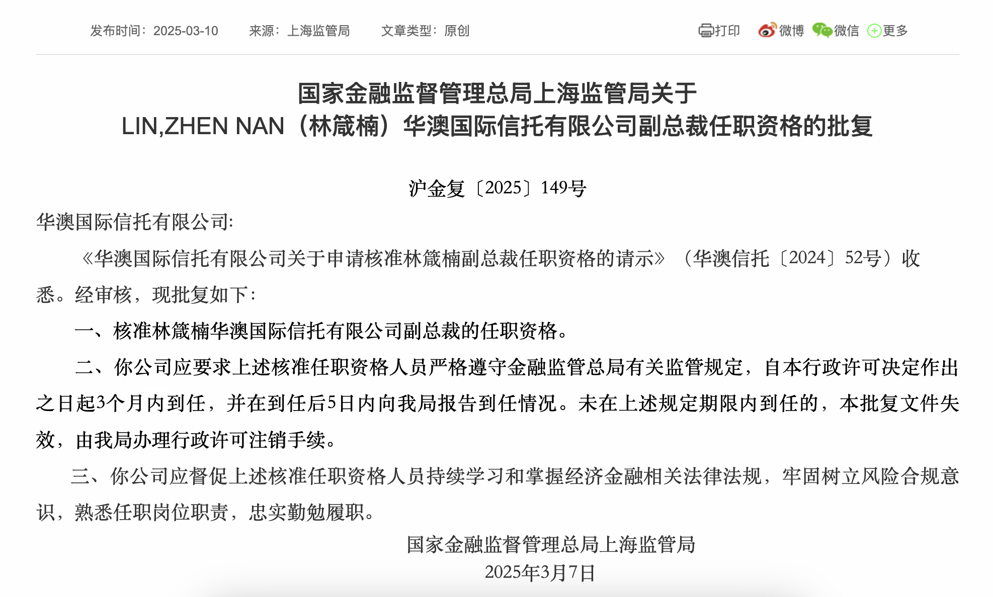 华澳信托成立于1992年,前身为昆明国际信托投资公司,注册资本25亿元。新任董事长战伟宏拥有丰富的金融监管以及信托从业经历,曾先后任职于央行总行、原银监会、中融信托等机构。而拥有“兴业背景”的还有华澳信托副总裁兼信息披露负责人杨伟琳,其曾任兴业银行南昌分行副行长。