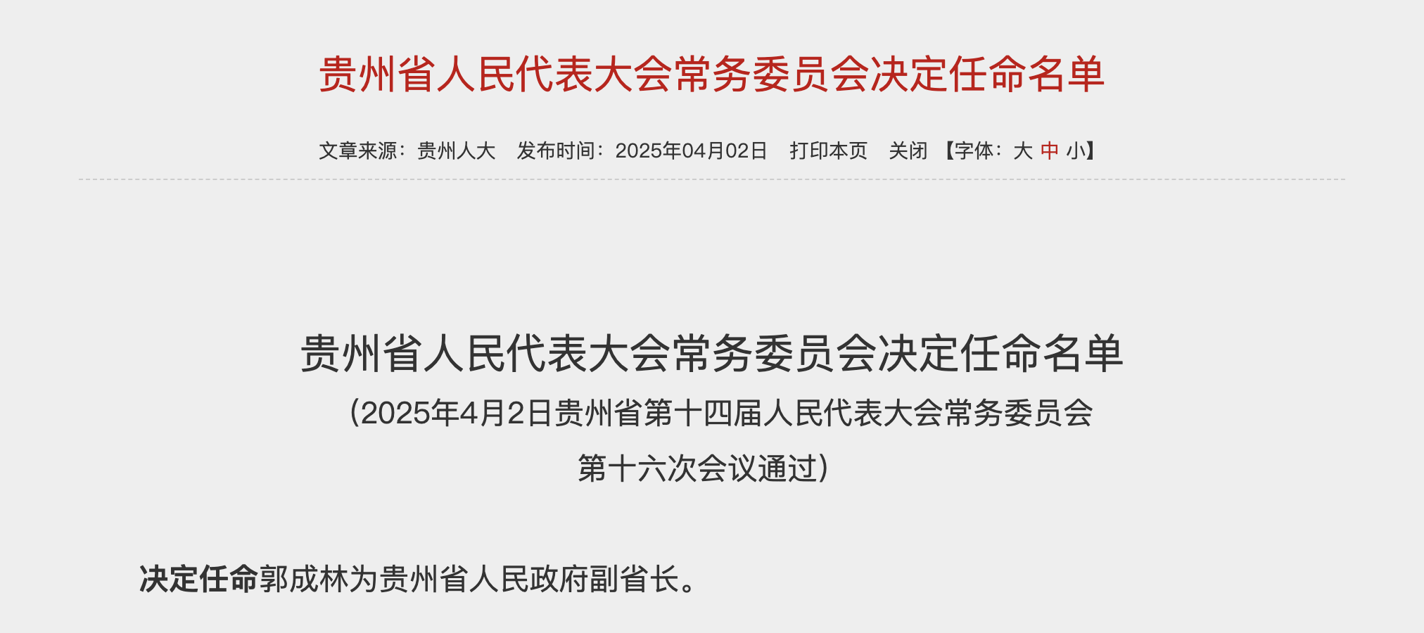 4月2日,贵州省人民代表大会常务委员会发布决定任命名单,郭成林被任命为贵州省人民政府副省长。同时,郭成林还担任中国邮政集团党组成员、总会计师及中邮证券董事长。