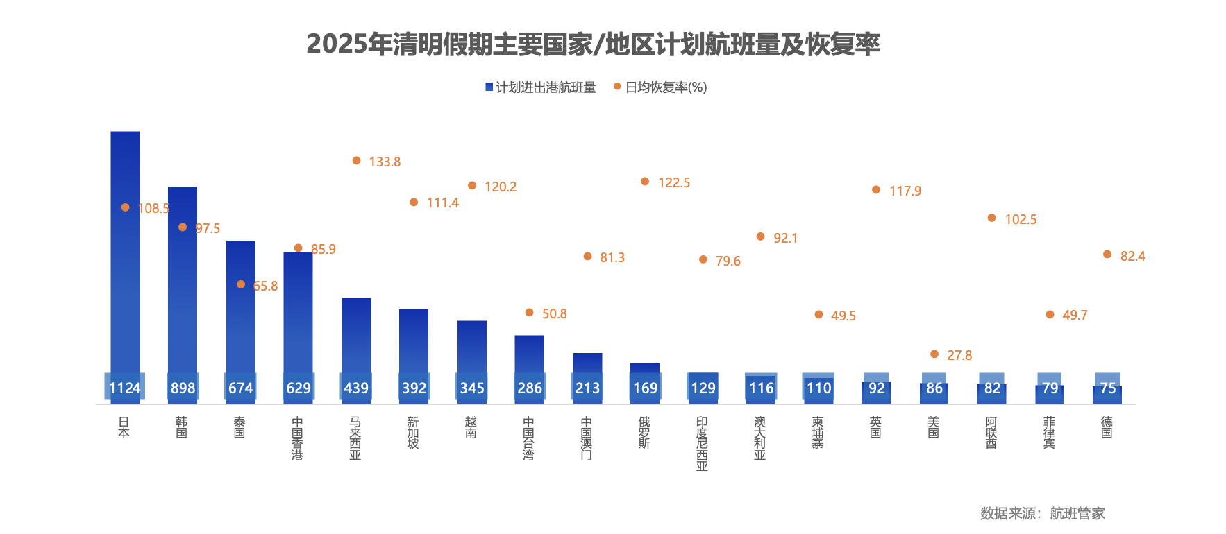 国际航班持续恢复,清明假期往返日本计划航班量位列第一,恢复率达108.5%。一季度国际及地区航线大幅增长,航班量和旅客量同比增速显著,国际航线客运规模首次超过疫情前水平。