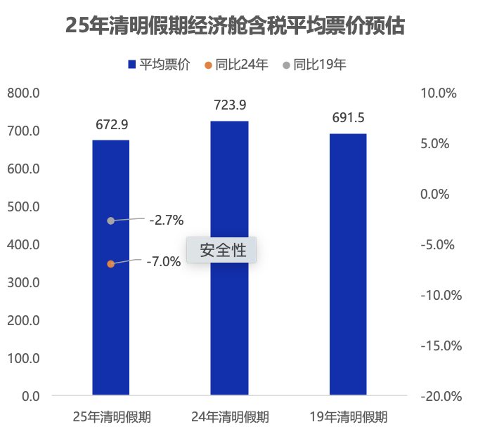 航班管家预估,清明假期民航国内机票(经济舱)均价约672.9元,同比2019年下降2.7%,同比2024年下降7.0%。