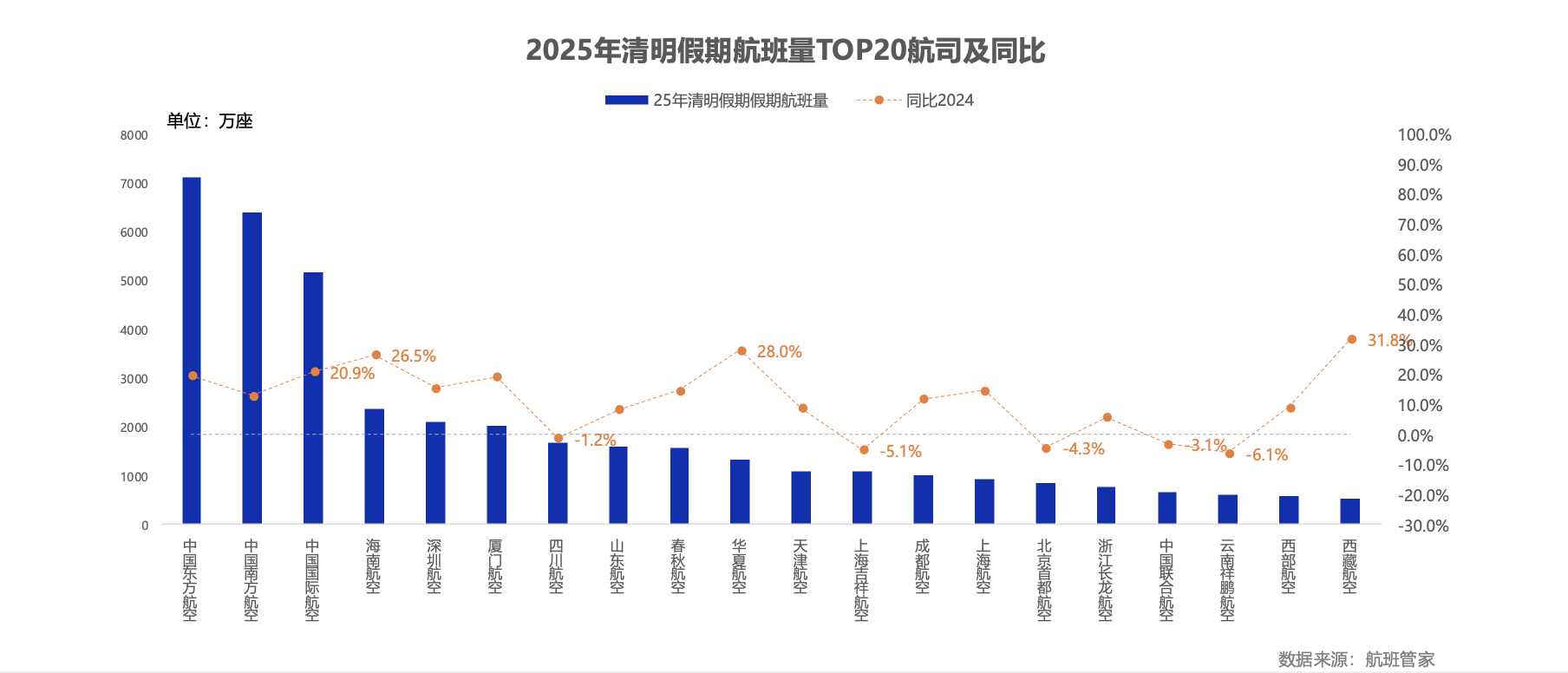 清明假期民航旅客需求不减,预计日均旅客量约187.6万人次,同比2024年增长10.3%。航班量预计日均超1.42万架次,同比2024年增长5.7%。多家航空公司航班量同比正增长,其中西藏航、华夏航、海航、国航增长显著。