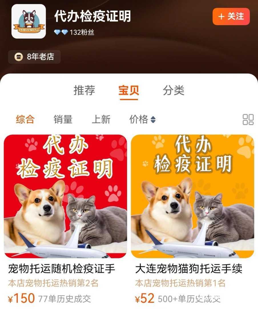 电商平台商家售卖“宠物托运检疫证手续”服务。