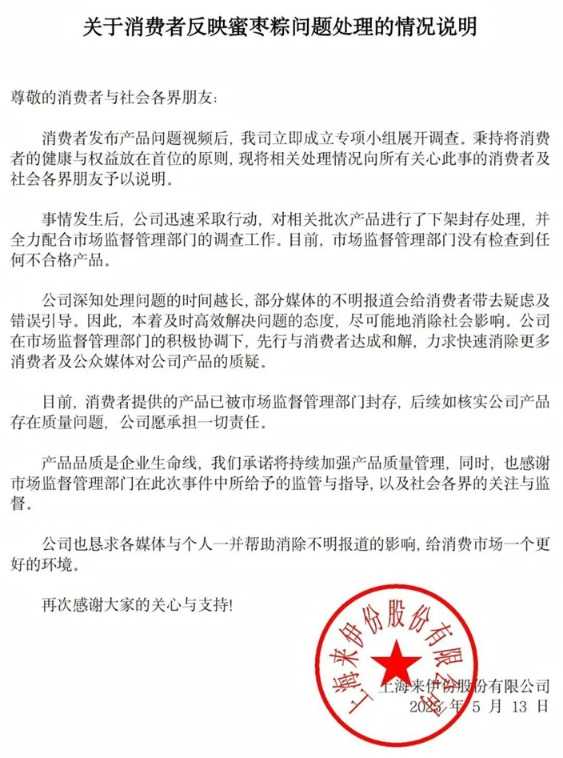 来伊份5月12日早间发布公告称,公司关注到公司蜜枣粽产品的相关舆情,管理层第一时间组织专项工作小组对相关问题进行全面核查,并启动全链路调查程序,积极与相关消费者沟通。同时,来伊份已全面下架本批次蜜枣粽产品,消费者可选择就近门店进行退换货,并可得到相同金额的额外补偿。