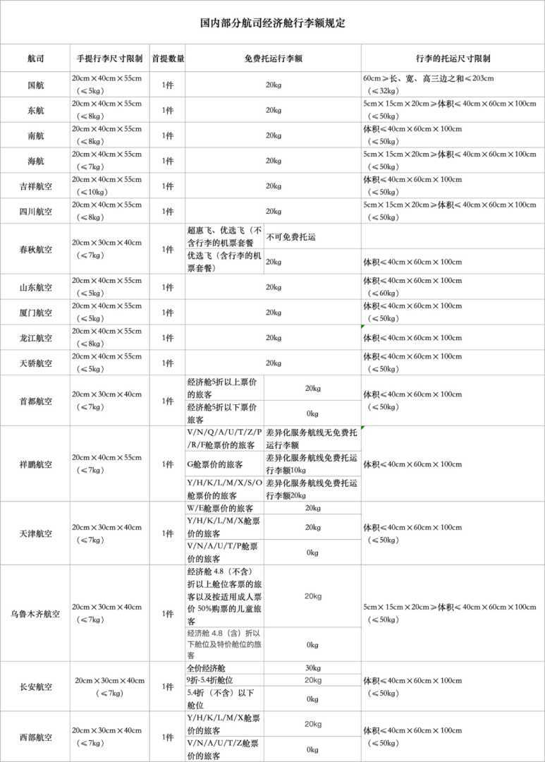 国航、东航等全服务航司均允许不超过20寸的行李箱免费带上飞机,而首都航空等低成本航司对免费带上飞机的行李箱尺寸要求不得超过40厘米×30厘米×20厘米。民航专家林智杰、广外南国商学院教授郭佳表示,航司间行李额规定不同,差别在于航司定位。